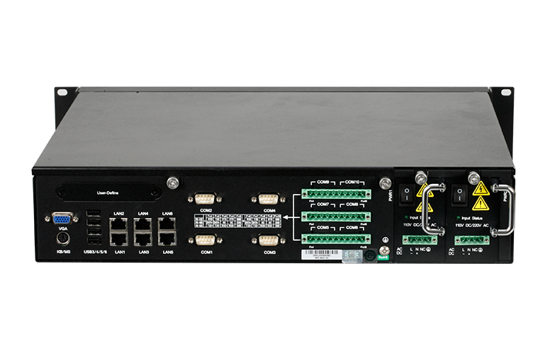 2U 19 寸上架型密封多串口服务器/Intel ATOM D525 1.8G/ 板载2G 内存 / 10 个隔离串口/6×1000M网口/USB2.0×6/PS/2×1/VGA×1/AC、DC110V~220V 输入 100W 双电源/ 失电报警/ 中性LOGO |